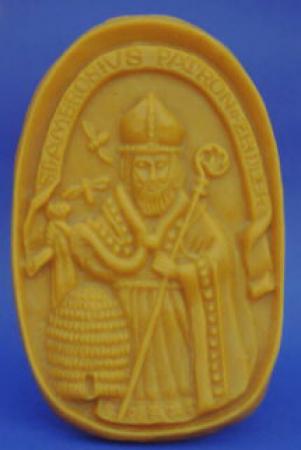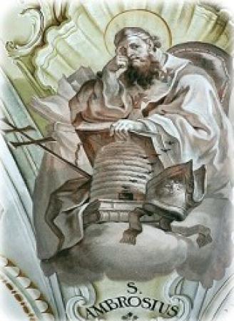 Sv. Ambróz sa narodil okolo roku 340 v Trevíri (Trier - na západe Nemecka, blízko hranice s Luxemburskom). Ambróz mal veľké nadanie, matka mu vybrala najlepších učiteľov tých čias. Získal dokonalý prehľad v umení, rečníctve a práve. Po štúdiách sa stal advokátom. Získal si obdiv svojou vzdelanosťou, výrečnosťou, spravodlivosťou a láskou. Vďaka svojmu priateľovi Aniciovi Probovi, miestodržiteľovi Talianska, sa stal prísediacim na súde na najvyšších štátnych úradoch. V roku 373 sa stal miestodržiteľom v Miláne, Piemonte, Janove a Bologni. Svoj úrad zastával so všetkou láskavosťou a vľúdnosťou, za čo si onedlho získal všeobecnú obľubu. 7. decembra bol vysvätený za milánskeho biskupa. Svoj hnuteľný majetok rozdal chudobným a stal sa ich zástancom. Bol apoštolom sociálnej spravodlivosti, hovoril, že „zem patrí všetkým a nie len bohatým“. Ambróz bol jedným z čelných predstaviteľov latinskej patristickej teológie, ovplyvnil liturgiu a cirkevný spev (ambroziánsky chorál). Zomrel roku 397 v Miláne a pochovaný bol v milánskej bazilike San Ambrogio. | | vosková plastika sv. Ambróza |