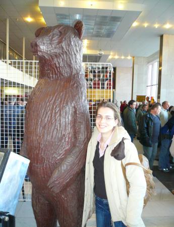 Hneď po prezentácii sme odovzdali svoj med na ochutnávku a vydali sme sa na prehliadku ponuky vystavovateľov. Po snahe vojsť do hlavnej miestnosti, kde vystavovali včelári zo Slovenska, Čiech a Poľska nás dav „vyniesol“ von, nedalo sa tu ani pohnúť a vzduch sa stával čoraz menej dýchateľným. Sústredili sme sa teda na prezentáciu výrobkov medovnikárov a predajcov sviečok, ktorí vystavovali v predsieni sály. Ich jemná práca a tvorivé nápady miestami človeku brali dych. Mnohých zaujal presklený úľ a prezentácia včelárskeho múzea. Nenechali sme si ujsť príležitosť vyfotiť sa pri figurálnom úli v tvare medveďa. Verím, že nám odpustia najmä včelári s vyššie položených častí krajiny, kde táto naša najväčšia šelma spôsobuje ich včelstvám nemalé problémy a je pre nich priam nočnou morou.