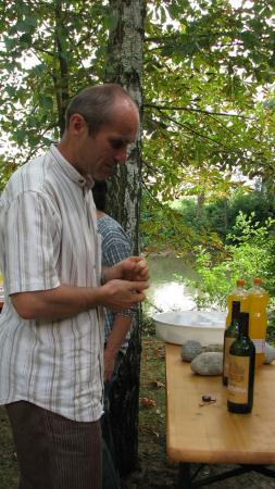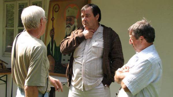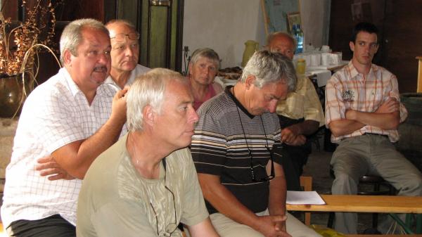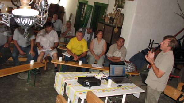 Po výdatnom obede v tieni stromov na brehu rieky Žitava a po tradičnej ochutnávke medu pokračovalo podujatie prednáškou Ing. Pavla Fiľa, riaditeľa strednej odbornej školy, ktorá okrem iných odborov, ako jediná na Slovensku ponúka výučný list v odbore včelár. Okrem aktualít z oblasti výskumu aplikácie organických liečiv, ktorých účinky skúmajú na školskej včelnici, sprostredkoval svoje zážitky z návštevy u Rakúskeho včelárskeho zväzu. Spomedzi množstva postrehov spomenul poriadok a disciplínu, ktorá vládne na včelárskych dvoroch. Na fotkách bolo vidieť, že predseda zväzu mal letáče úľov orientované smerom na svoj pozemok, hoci susedný pozemok nevyzeral byť obývaný a od včelárovho bol oddelený hustou alejou stromov. Včelári spod Álp dodržiavajú veľmi prísne termíny liečenia včelstiev. V prípade nepolepšiteľných včelárov, ktorí zanedbávajú liečenie nemajú problém s ich nahlásením kompetentným úradom. Prednáška vyústila do hodinovej diskusie z ktorej sa nikomu z účastníkov nechcelo odchádzať domov. | | Ing. Fiľo sa pútavo delí o svoje skúsenosti |
