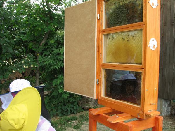 včelnice a novo nainštalovaného pozorovacieho úľa s presklenými stenami.